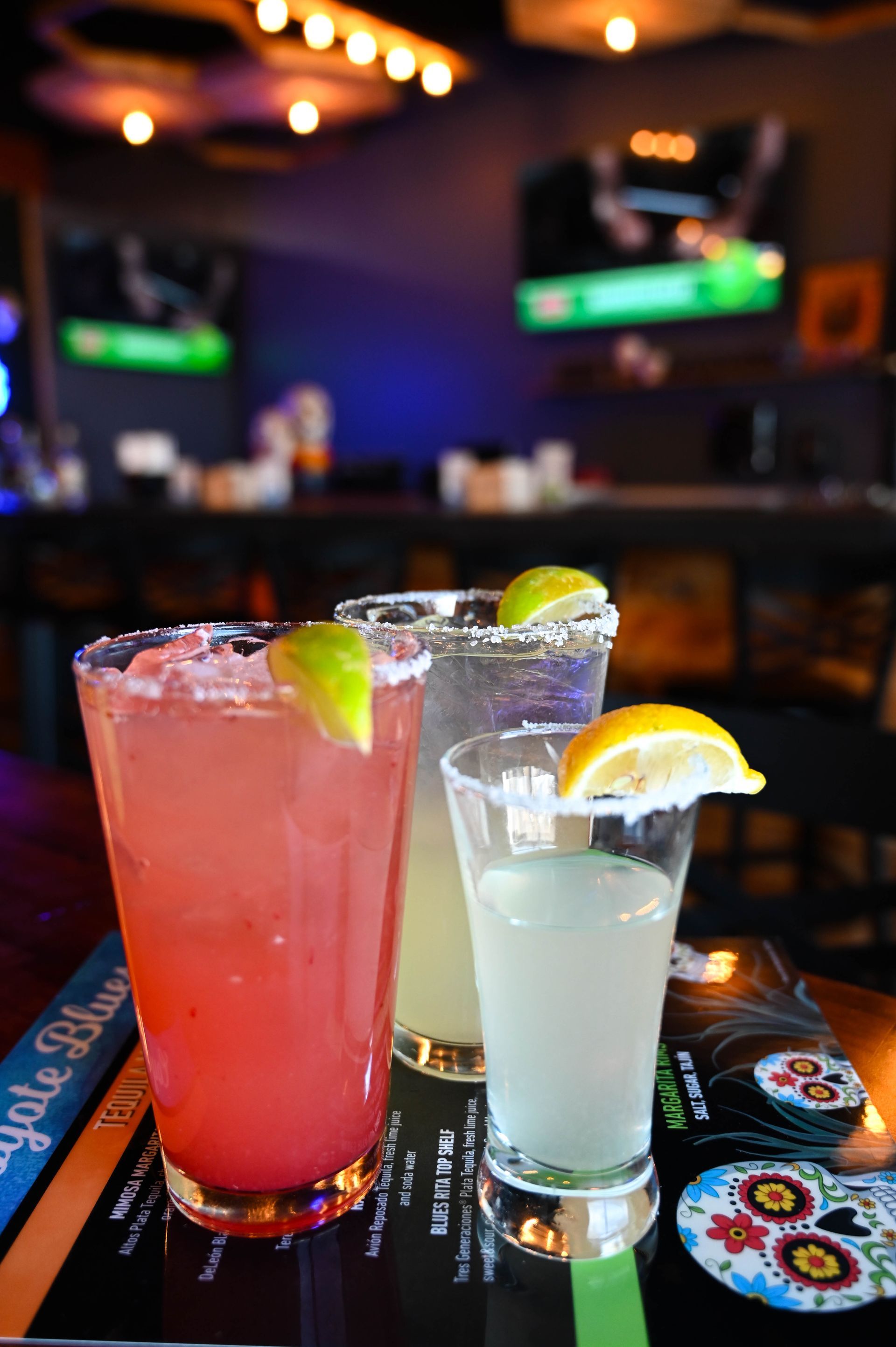 Margarita on the rocks topped with Blue Curacao with salted rim.