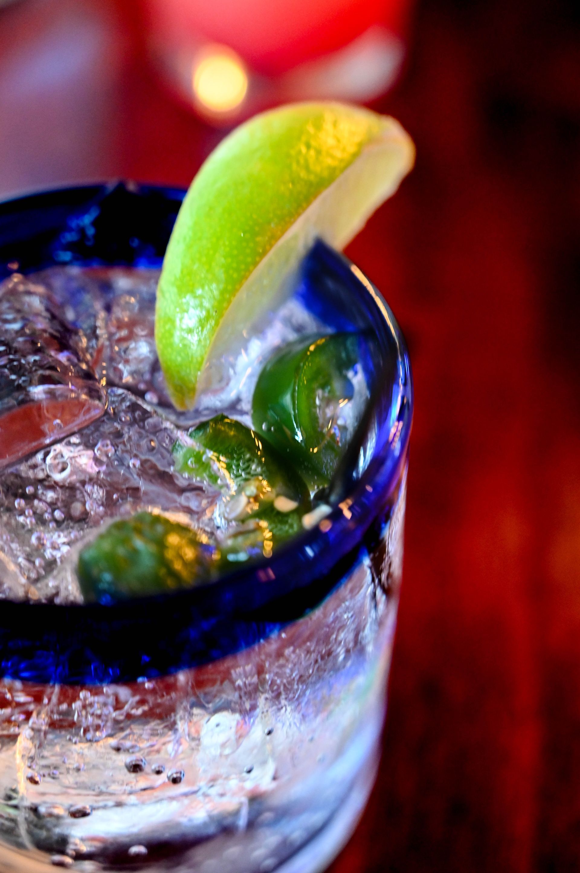 Margarita on the rocks infused with\ fresh jalapenos with salted rim.