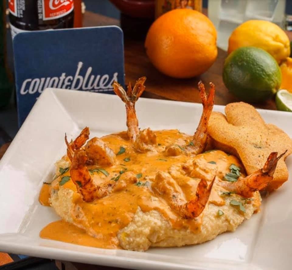 Shrimp on our signature poblano cheese grits, topped with red bell pepper cream sauce. Served with mexican cornbread.